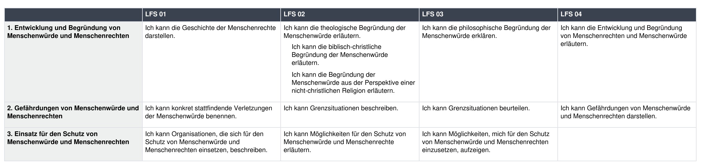 - Ich kann die Entwicklung und Begründung von Menschenwürde und Menschenrechten erläutern.