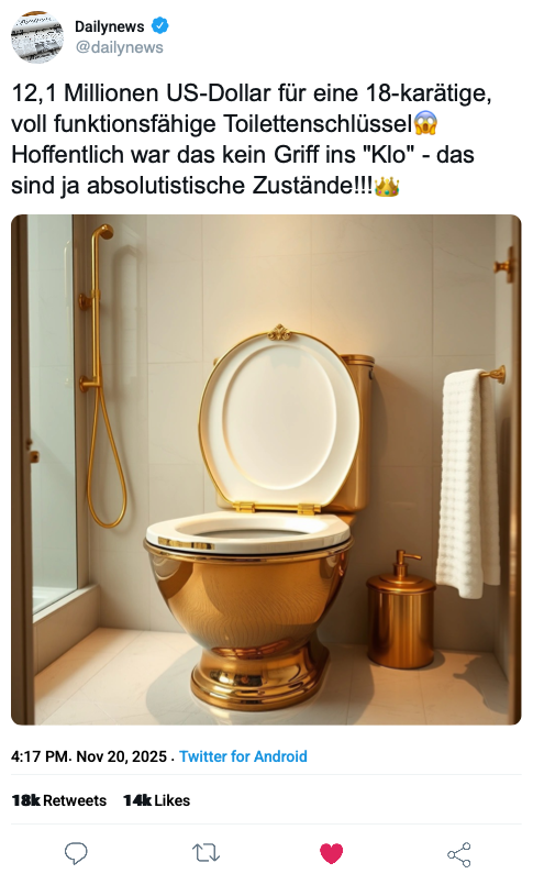 1. Im November 2025 kam es in New York zur Versteigerung einer vergoldeten Toilettenschüssel. Betrachten Sie zunächst den der Berichterstattung nachempfundenen Social Media Post.