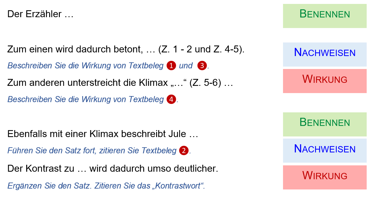 Gehen Sie dabei nach dem vorgestellten Schema vor: BENENNEN - NACHWEISEN - WIRKUNG ERKLÄREN. Die Anleitung hilft Ihnen dabei.