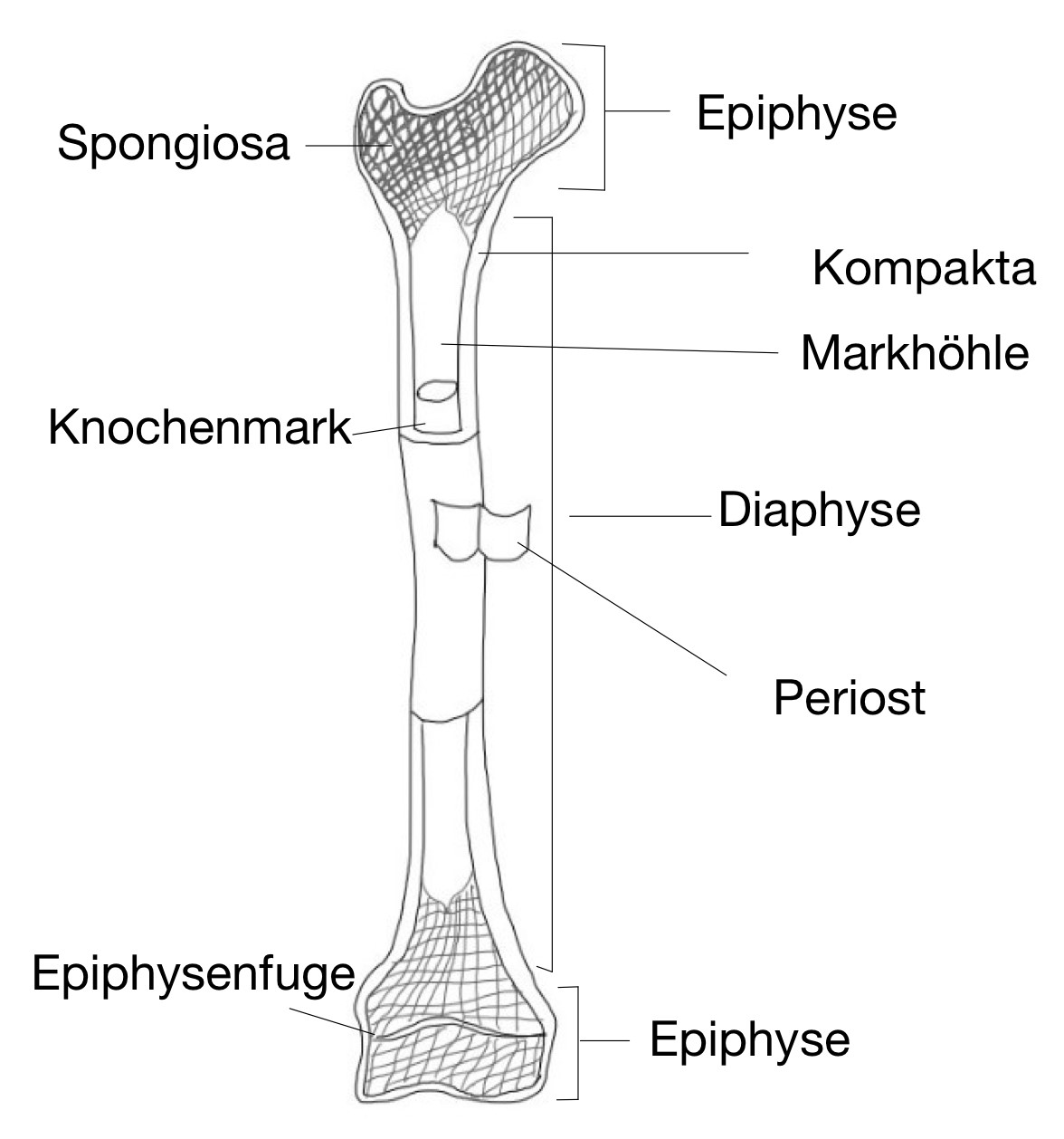 Die Feinstruktur des Röhrenknochens besteht aus Periost, Kompakta und Spongiosa: