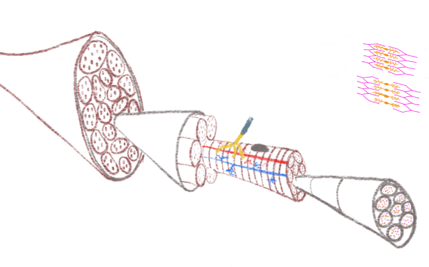 Der grundlegende Baustein des Skelettmuskelgewebes ist die quergestreifte Muskelfaser, eine Muskelzelle. Mehrere Muskelzellen bilden ein Muskelfaserbündel. Muskelfasern enthalten Zellkerne und werden vom Blutgefäßsystem versorgt.