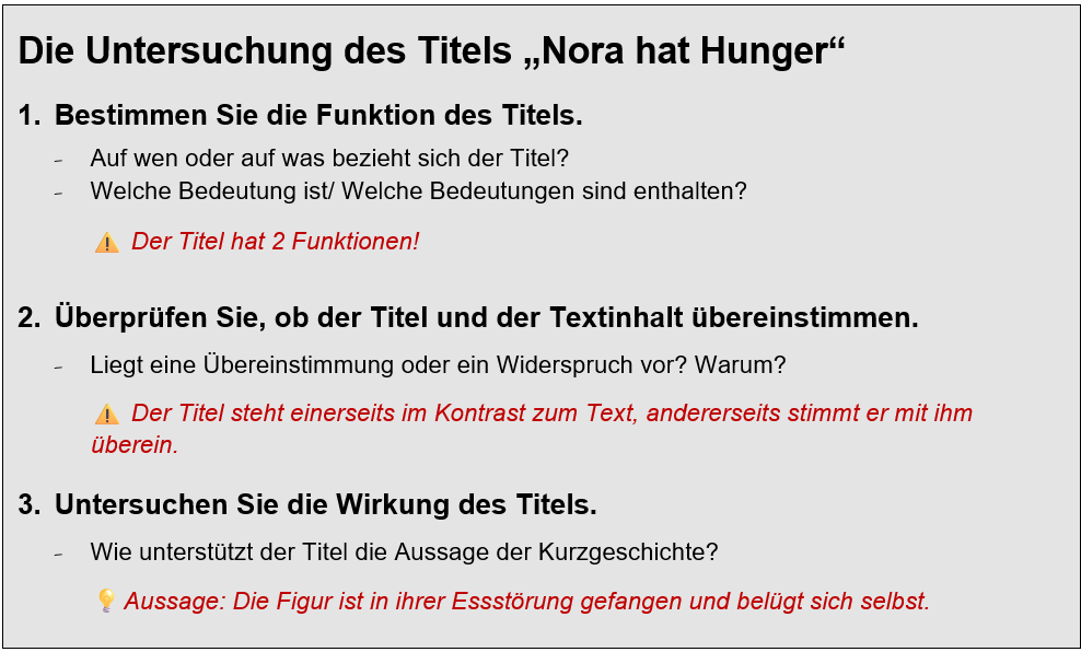 - Der Titel „Nora hat Hunger“ hat eine Wirkungsfunktion und lässt den Leser/die Leserin erwarten, dass …