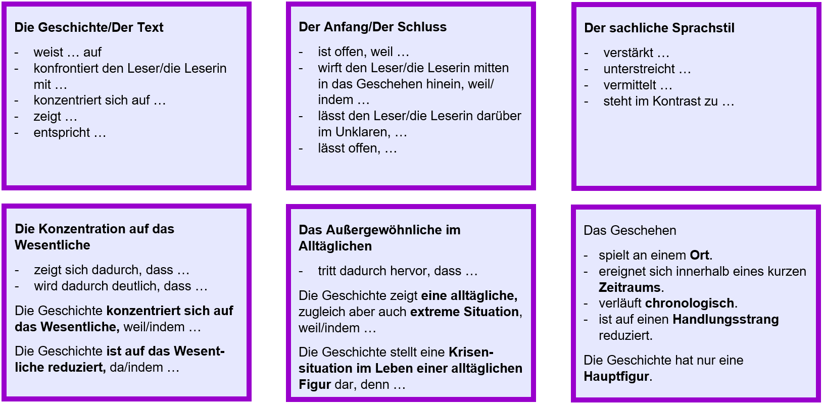 ⚠️ HINWEIS: Im Aufsatz müssen Sie nicht alle 10 Merkmale einer Kurzgeschichte nachweisen. Beschränken Sie sich auf 4-5 Kennzeichen. Stellen Sie am besten die Merkmale dar, die in der Geschichte besonders deutlich hervortreten.
