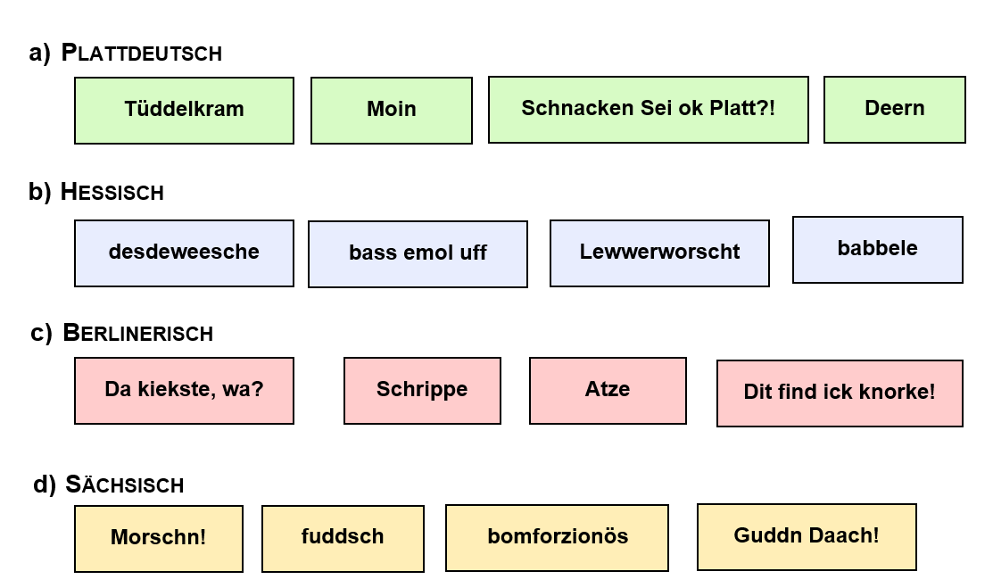 Wählen Sie einen der Dialekte aus und recherchieren Sie im Internet, was die Ausdrücke in der Standardsprache bedeuten.