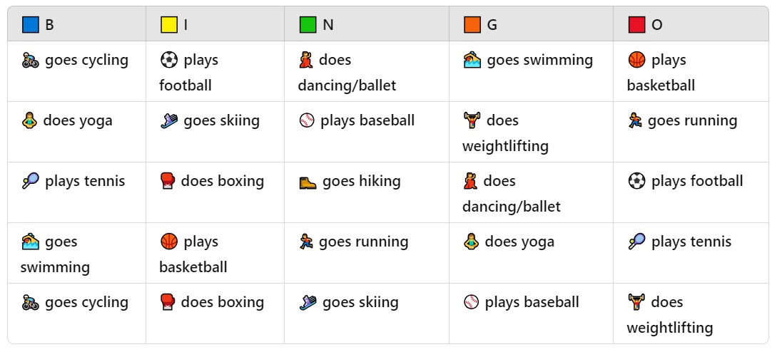 - Talk to your classmates to find someone who does the activities listed on the bingo sheet.