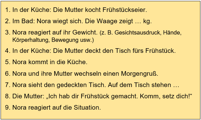 Beispiel: Als Nora aufwacht, knurrt ihr Magen. Sie sucht ihre Hausschuhe und geht ins Bad. …