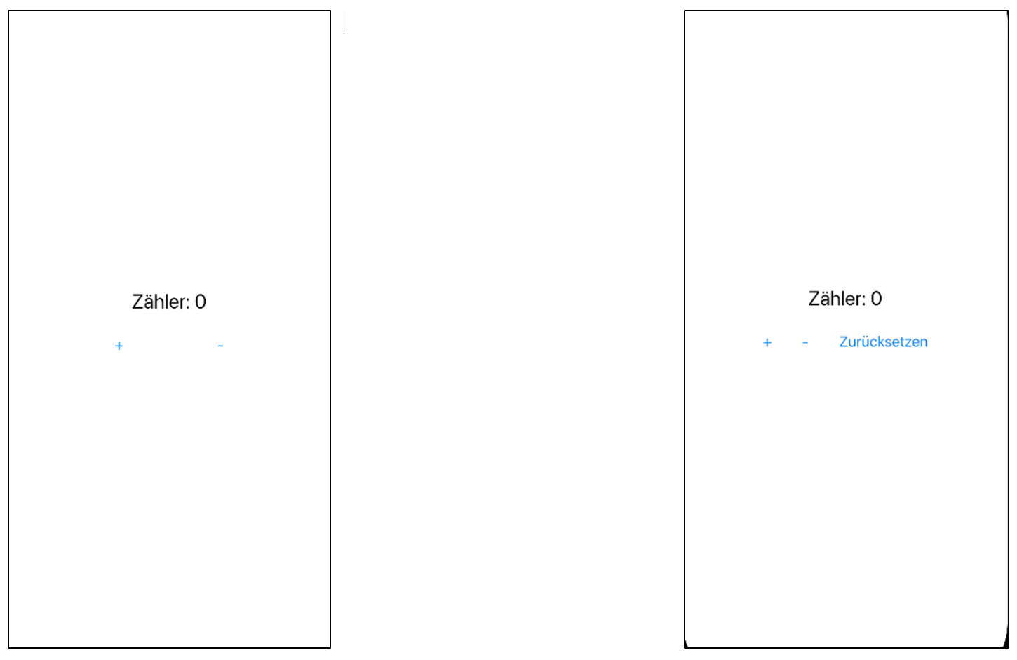 Die App zeigt aktuell einen Zähler, der mit zwei Buttons (+ und –) verändert werden kann. Die Buttons befinden sich bereits in einer eigenen Datei ButtonComponent.js. Ihre Aufgabe besteht darin, einen zusätzlichen „Zurücksetzen“-Button zu ergänzen, der den Zähler auf 0 setzt.
